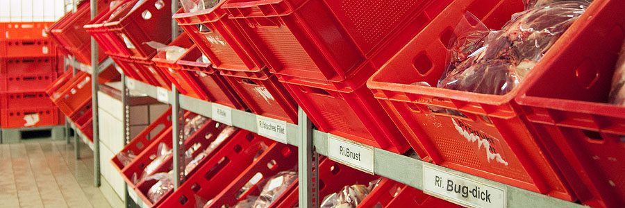 Auch der Transport bestimmt die Qualität. Spezielle Kühlfahrzeuge, ausgestattet mit Rohrbahnen, halten die Rinder- und Schweinehälften frisch und können mittels dieser Rohrbahnen vom LKW direkt in den Betrieb geschoben werden. Ebenso erleichtern die genormten, roten E2-Kisten den logistischen Ablauf.