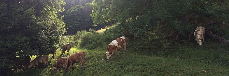 Direkt gegenüber unseres Firmengebäudes befindet sich unsere weitläufige Viehweide mit ca. 4000 qm Fläche. Im Frühjahr werden die Rinder auf die Weide getrieben. Sie finden frisches Grün, sprudelnde Quellen, schattenspendende Bäume und einen Unterstand, den sie vor allem aus Schutz vor Hitze aufsuchen.